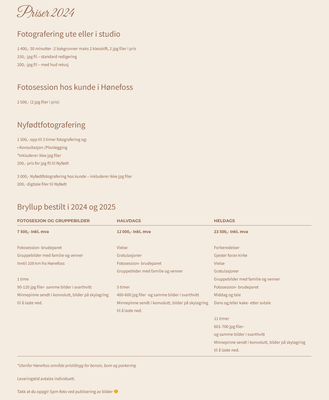 | 9 500,- inkl. mva • 1 time fotografering • 90–120 bilder (farge + svart/hvitt) • Minnepinnen sendes per post. Bildene gjøres tilgjengelige via en skylink som er aktiv i seks måneder. • Inntil 100 km fra Hønefoss | 14 500,- inkl. mva Inkluderer for eksempel: • Vielse • Gratulasjoner • Fotosession – brudeparet • Gruppebilder Varighet: 5 timer Bilder: 500–600 (farge + svart/hvitt) • Minnepinnen sendes per post. Bildene gjøres tilgjengelige via en skylink som er aktiv i seks måneder. | 26 500,- inkl. mva Inkluderer: • Forberedelser • Gjester foran kirken • Vielse • Gratulasjoner • Gruppebilder • Fotosession – brudeparet • Middag og taler • Dans og/eller kake – etter avtale Varighet: 12 timer Bilder: 700–950 (farge + svart/hvitt) • Minnepinnen sendes per post. Bildene gjøres tilgjengelige via en skylink som er aktiv i seks måneder. |